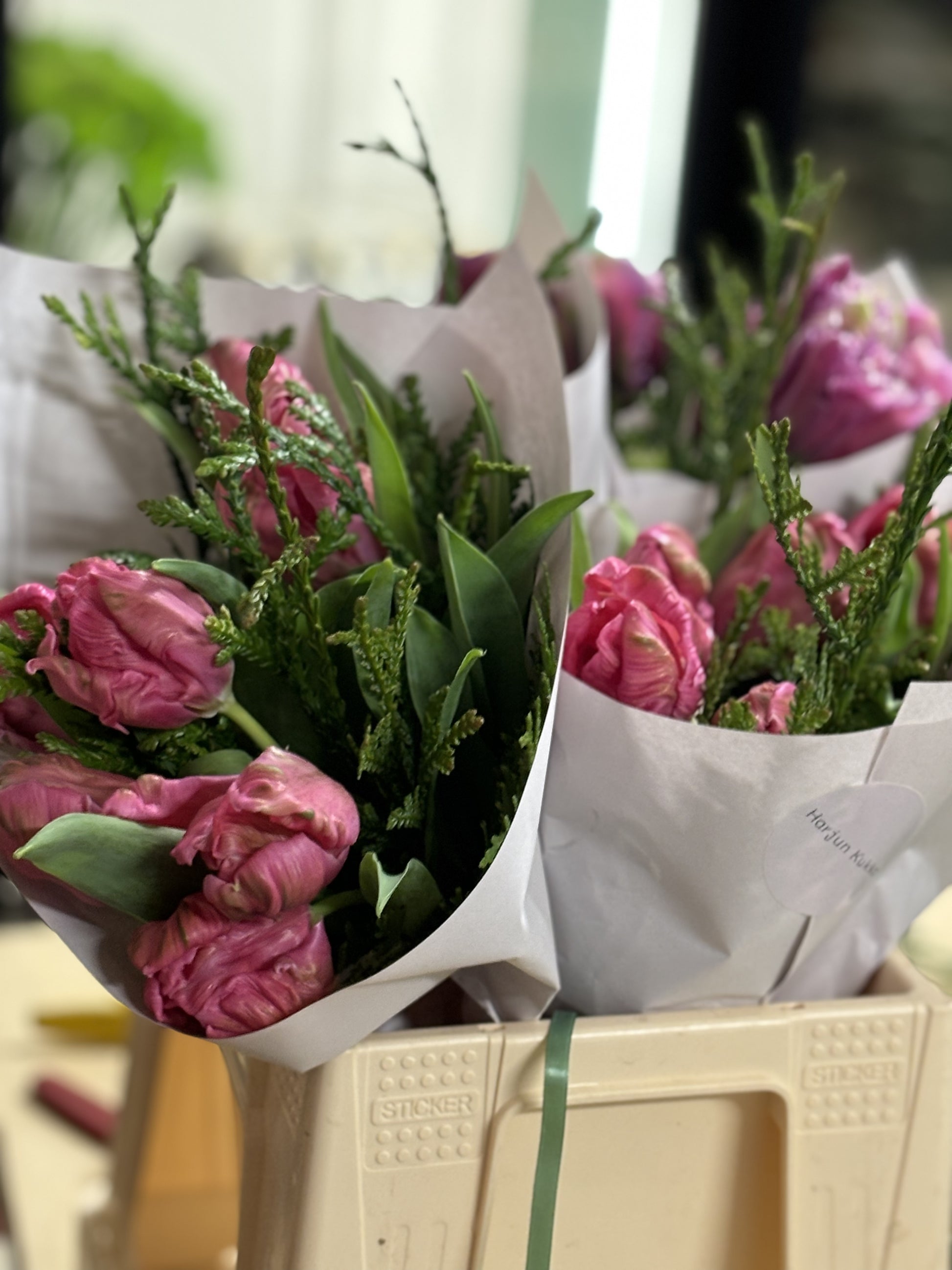 Nippu tulppaaneja sidottuna sesongin havujen kanssa, värit vaihtelevät saatavuuden mukaan.